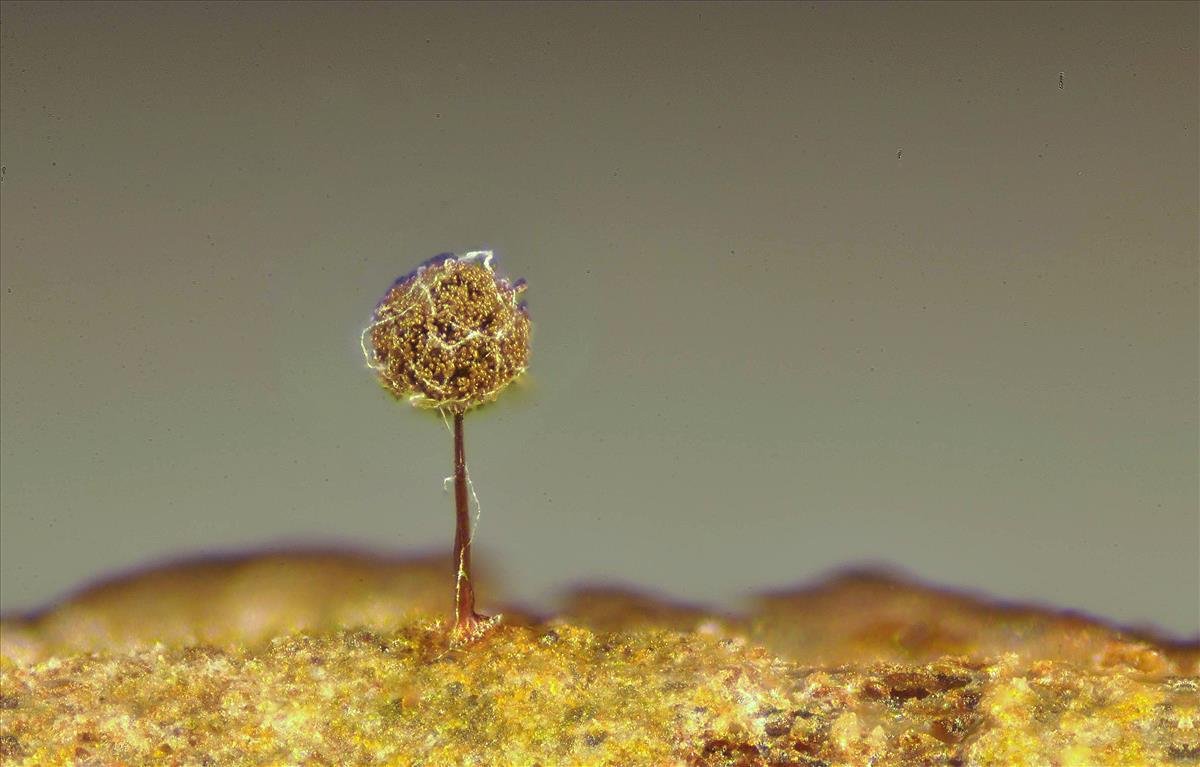 Macbrideola cornea in kweekbak op schors van Taxus cuspidata, herbariumnummer "Plaisier 1074", sporen niet uitgeblazen, witte draden horen er niet bij.