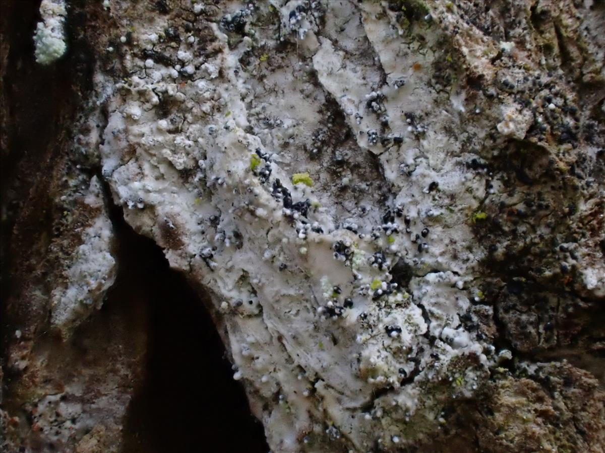 Thallus met witberijpte pycnidiën op Salix in wilgenvloedbos