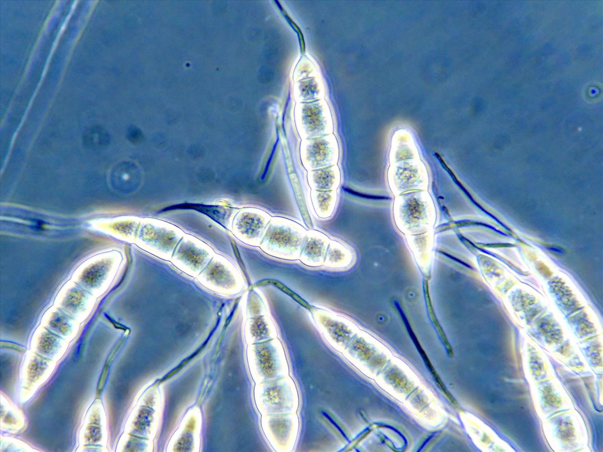 Conidia met lange aanhangsels (in fase-contrast) op blad Grote vossenstaart