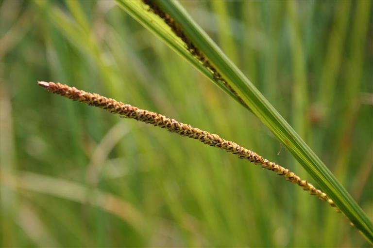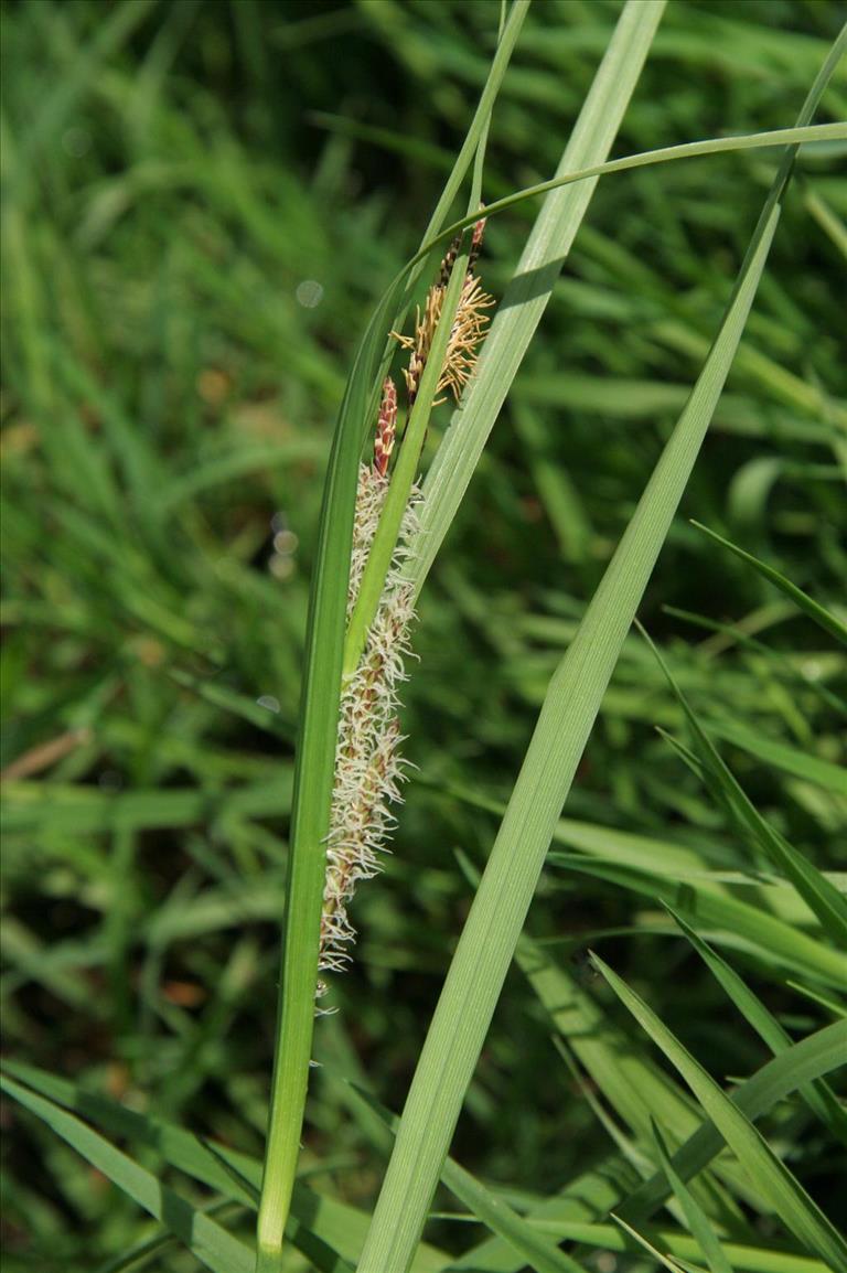 Bloemen - Eenslachtig (een bloem met alleen mannelijke of alleen vrouwelijke geslachtsorganen). Eenhuizig (mannelijke en vrouwelijke bloemen op dezelfde plant). De bloeiwijze is niet onderbroken en beslaat ongeveer het bovenste kwart van de halm. Meestal zijn er 2 of 3 mannelijke aren en daaronder 3 tot 5 vrouwelijke aren. De bloemen bevatten 2 stempels. De rechtopstaande aren zijn kort gesteeld tot zittend en minder dan 5 mm dik. De iets knotsvormige vrouwelijke aren worden naar de voet ijler. De schutbladen van de vrouwelijke bloemen zijn bladachtig, gootvormig en hebben geen schede. Gewoonlijk steekt meer dan 1 schutblad boven de bloeiwijze uit. Het onderste omvat met 2 donkere oortjes de stengel.