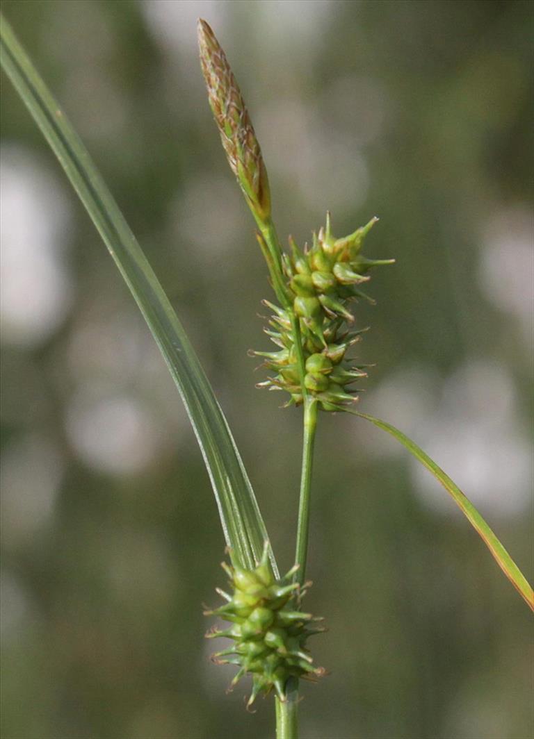 Bloemen - Eenslachtig (een bloem met alleen mannelijke of alleen vrouwelijke geslachtsorganen). Eenhuizig (mannelijke en vrouwelijke bloemen op dezelfde plant). De bloeiwijze bestaat uit een gesteelde (de steel wordt tot 2 cm) of soms bijna zittende mannelijke topaar en twee tot vier rechtopstaande, eivormige en dichtbloemige vrouwelijke aren. Drie stempels per bloem. De vrouwelijke aren staan voor het grootste deel dicht opeen. Soms is er nog een vrouwelijke aar in of onder het midden van de halm. De schutbladen zijn bladachtig en komen tot voorbij de top van de bloeiwijze. Vaak staan ze haaks af of zijn ze teruggeslagen. De plant heeft een korte schede. Het rechtopstaande schutblad van een onderste aar heeft een langere schede, waar de aarsteel vaak iets uitsteekt.