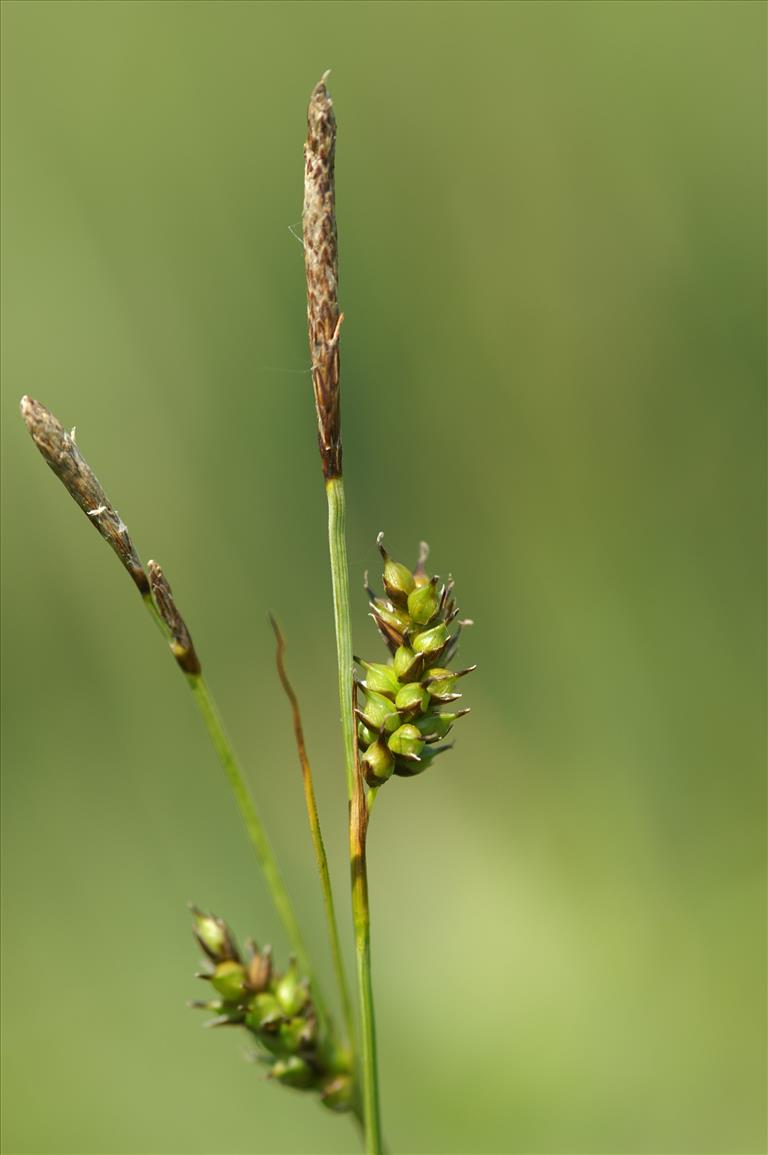 Bloemen - Eenslachtig (een bloem met alleen mannelijke of alleen vrouwelijke geslachtsorganen). Eenhuizig (mannelijke en vrouwelijke bloemen op dezelfde plant). Een mannelijke topaar die 2-3 mm breed is (soms is er een tweede, kleinere mannelijke aar aan de voet) en meestal twee of drie vrij ver uit elkaar staande, rechtopstaande vrouwelijke aren die 5-7 mm breed zijn en ongeveer 10 mm lang. Vrouwelijke bloemen hebben drie stempels. De schutbladen zijn veel korter dan de bloeiwijze. Ze hebben een nauwe, tot vier cm lange schede. De kafjes zijn ongeveer 3 mm lang en hebben een vliezige rand. Ze zijn roodbruin (in het midden zijn ze lichter, maar meestal niet groen).
