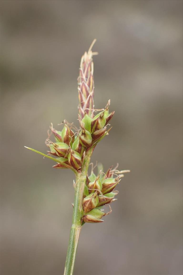 Bloemen - Eenslachtig (een bloem met alleen mannelijke of alleen vrouwelijke geslachtsorganen). Eenhuizig (mannelijke en vrouwelijke bloemen op dezelfde plant). De bloemen groeien in een compacte bloeiwijze met 1 mannelijke topaar en 2 of 3 kortere, eivormige tot bolronde, dicht bijeen zittende, rechtopstaande en niet gesteelde vrouwelijke aren die tot 7 mm lang worden en tot 5 mm breed. Ze hebben 3 stempels. De schutbladen hebben geen schede en staan tenslotte schuin tot recht af. Het onderste is meestal niet langer dan de bloeiwijze.
