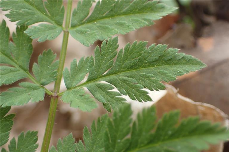 Bladeren - De bladeren zijn 2 of 3-voudig geveerd met langwerpige, diep getande lobben. Ze zijn zacht behaard en hebben meestal plaatselijk een witachtige tekening. De bladschede is sterk ontwikkeld.