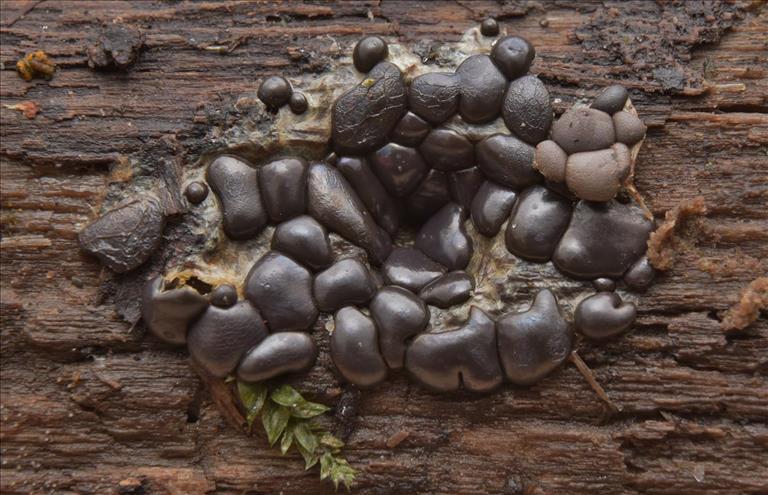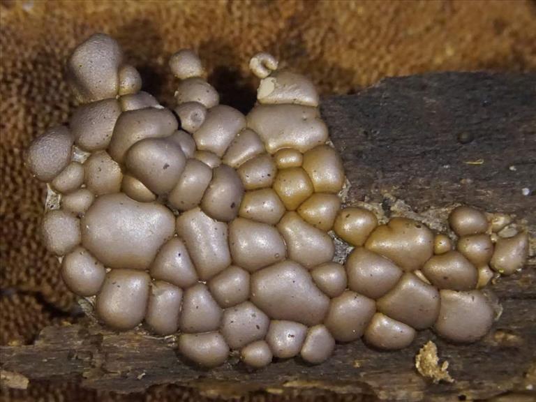 nat loofbos op zeer natte vergane stronk hout en op een oudePopulierblad , hoofddorp meerbos, © Laurens van der Linde