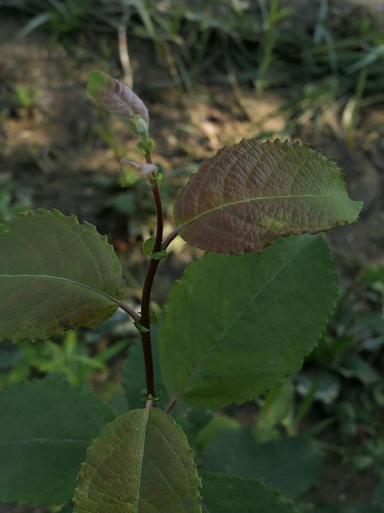 Bladeren - De enigszins gekartelde bladeren zijn meestal eirond, maar soms vrij langwerpig en worden 3-10 cm lang. Ze zijn eerst aan beide kanten dicht behaard, later wordt de bovenkant kaal. Verder zijn ze enigszins glanzend, van boven donkergroen en van onderen zacht grijsharig. De bladtop is spits, min of meer gedraaid en iets gootvormig. De steunblaadjes zijn vrij groot, half-hartvormig.