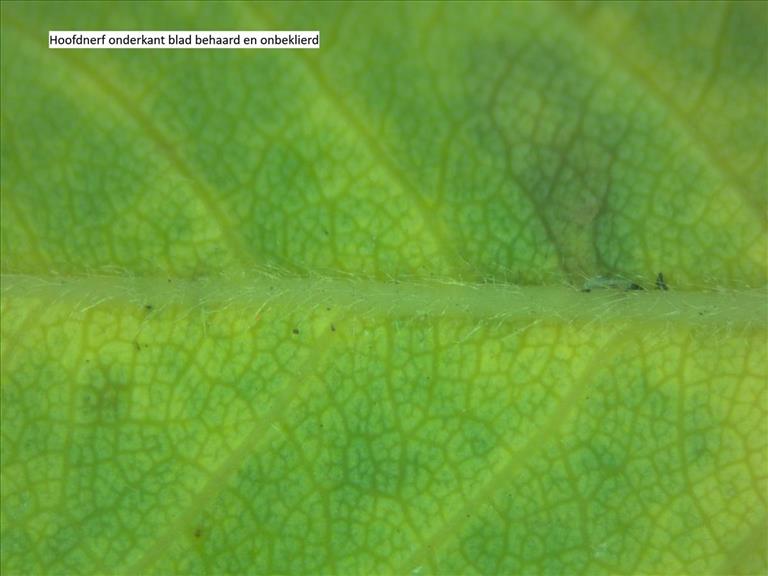 Hoofdnerf onderkant blaadje zonder klieren en zwak behaard, zijnerven vrijwel kaal, Maastricht Sint Pietersberg, © Jan Klinckenberg