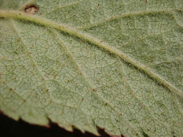 Onderkant blaadje sterk behaard en bezet met kort gesteelde klieren (Egelantierklieren)., Friesland, Drogeham-Hamstermieden, © Harry Waltje