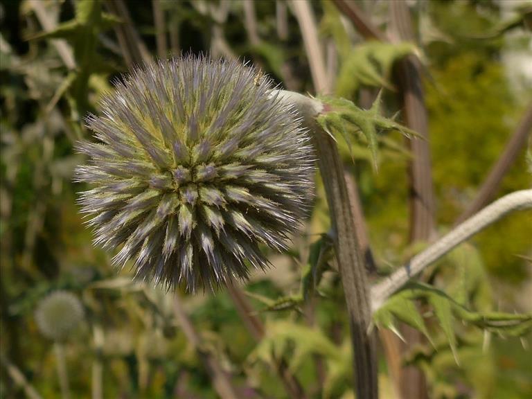 Bloemen - Tweeslachtig (een bloem met zowel mannelijke als vrouwelijke geslachtsorganen). De alleenstaande, bolvormige bloeiwijze is 3-6 cm. Deze is samengesteld uit talrijke lichtblauwe, blauwgroene of iets witachtige hoofdjes. Alle bloemen zijn buisvormig (geen straalbloemen). De witte buitenomwindselharen staan vrij of zijn alleen aan de voet vergroeid.