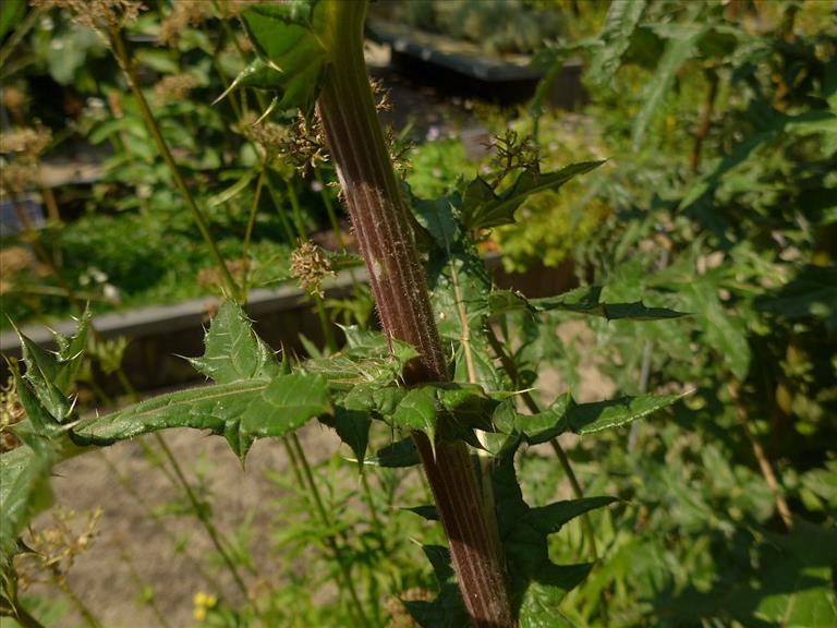 Bladeren - De bladen zijn distelachtig, langwerpig-elliptisch en veerspletig. Ze hebben een fijnstekelige rand. De bladslippen lopen in een fijne stekel uit. Aan de bovenkant groeien tot 0,5 mm lange klierharen en gewone haren, van onderen zijn ze witviltig.