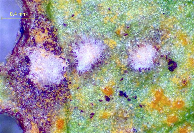 Hyperparasiet (wit) op uredinia van de Algemene oranje roest (Coleosporium tussilaginis), Driebergen , © Eduard Osieck
