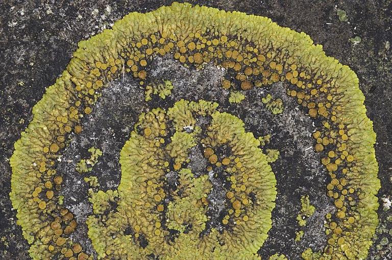 Geelgroene, korstvomige soort met randlobben en oranje apotheciën. Thallus meestal met witte berijping. Op (half)beschaduwde muren van oude gebouwen. De algemenere Calogaya pusilla is meer oranjegeel van kleur en is een pionier op kalkrijke substraten, zoals beton en kalksteen op zonnige, droge plekken.