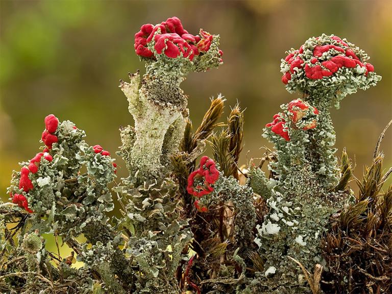 Blauwgrijs bekermos met rode apotheciën in duin, heide en stuifzand. Wordt wel verward met andere soorten met rode vruchtlichamen, zoals Cladonia macilenta en Cladonia floerkeana, die beide geen bekervormige, maar staafvormige tot vertakte podetiën hebben.