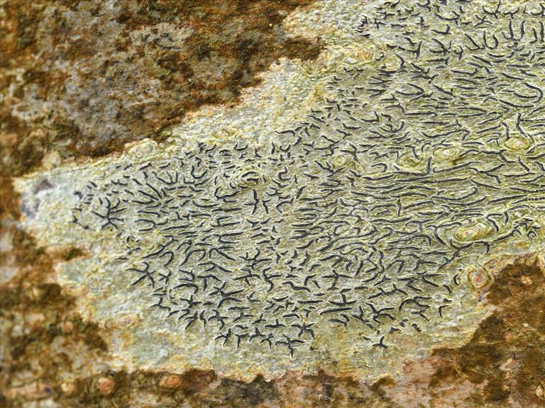 Thallus met apotheciën op duindoorn in duindoornstruweel, Grevelingen, Veermansplaat, © Henk-Jan van der Kolk