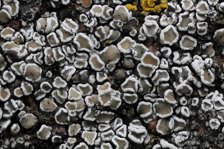 Korstvormige soort met bruine apotheciën met grijze rand. Thallus niet zichtbaar, ingezonken in het substraat. Apotheciën dicht opeenstaand en binnen een thallus vaak van gelijke grootte. Pionier op allerlei kalkrijke en voedselrijke substraten, zoals steen, hout en boomvoeten. Lecanora semipallida groeit op horizontale kalkhoudende oppervlakken, vooral harde kalksteen en beton, en heeft apotheciën met een helder(geel)witte rand die op een meer regelmatiger afstand van elkaar staan. Het thallus is zichtbaar als een grijze kring. Myriolecis hagenii heeft bruingrijze apotheciën met een grijze rand. De apotheciën zijn binnen een thallus in allerlei ontwikkelingsstadia te vinden.