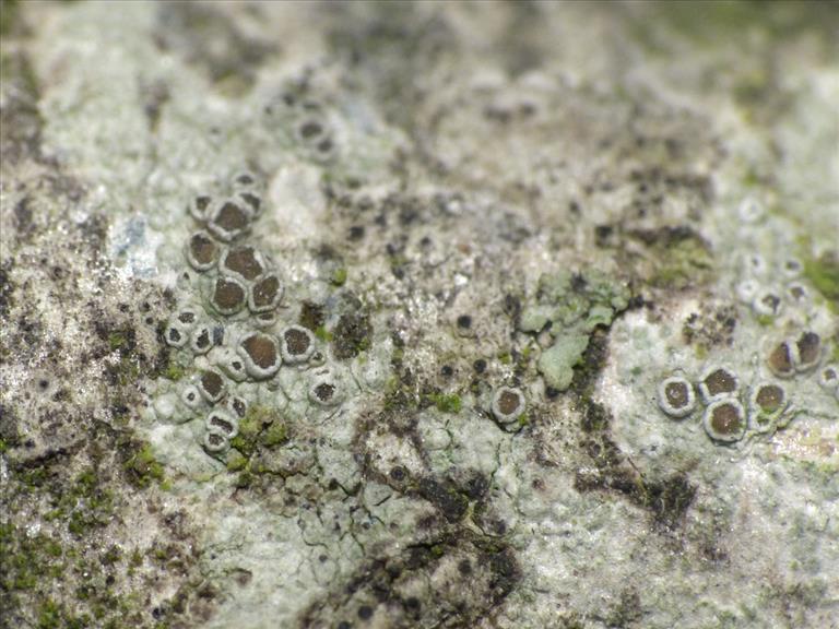 Dun thallus met apotheciën op tak van Salix. Microscopisch onderzocht, Renkum, golfbaan, © Henk-Jan van der Kolk
