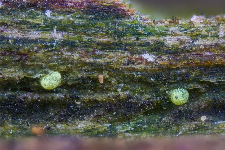 Op afgestorven thalli van Rode heikorst (Baeomyces rufus) op lemige steilkant in heide, Ede, Ginkelse Heide, © Henk-Jan van der Kolk