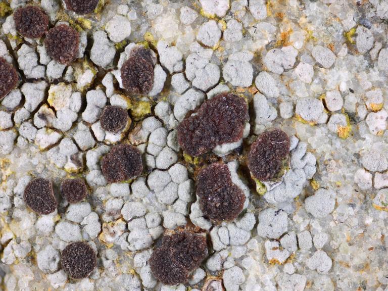 Thallus met berijpte apotheciën op oude bakstenen tuinmuur, Monster, Heijdse weg, © Hans Toetenel