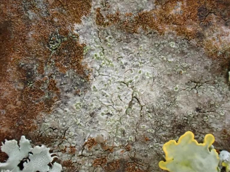 Korstvormige soort met een dun grijs thallus met ronde tot langwerpige groene soredieuze plekken en oranje apotheciën. Epifytisch op vrijstaande populieren, abelen en iepen, vooral in de binnenduinrand.