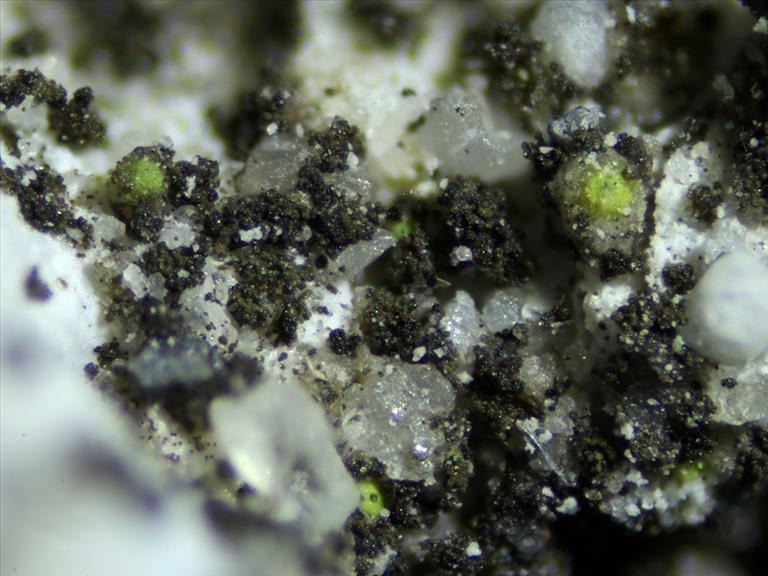 Lichtbruine peritheciën met geelberijpte top. Op granieten kei op begraafplaats, Weiwerd, © Henk-Jan van der Kolk