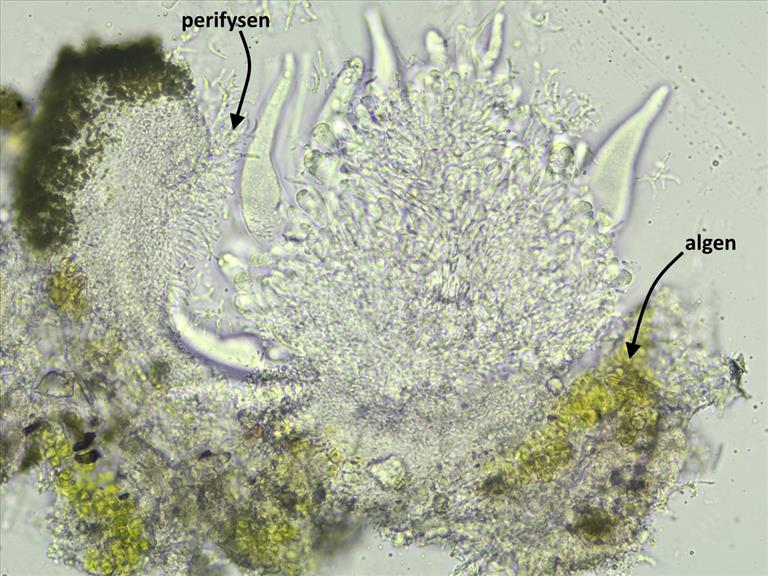 Doorsnede perithecium waarbij perifysen en algenlaag zichtbaar zijn, Weiwerd, © Henk-Jan van der Kolk