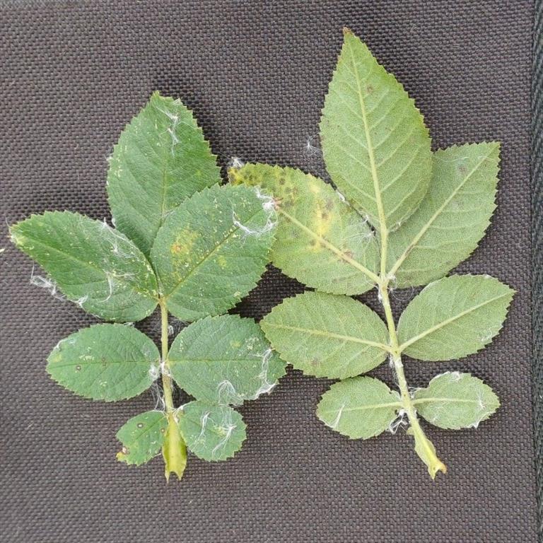 Bladeren - Viltig behaarde blaadjes, zonder klieren op de bladonderzijde. Behaarde struweelroos oogt op afstand blauwachtig grijs door de viltige beharing, die nog meer uitgesproken is dan bij de Viltroos groep. De blaadjes zijn enkelvoudig tot meervoudig gezaagd.