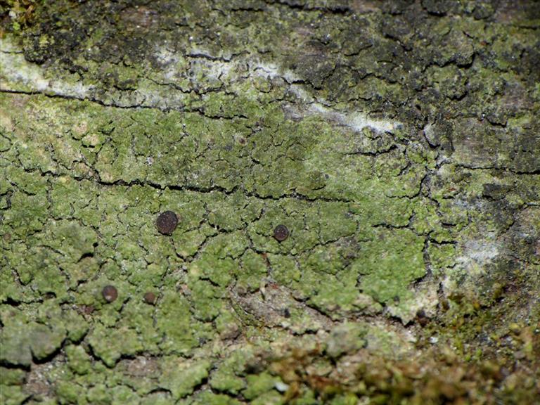 Thallus met wit prothallus. Op verweerd hardhout van hardhouten vlonder in vochtig loofbos, Strijensas, Esscheplaat, © Henk-Jan van der Kolk