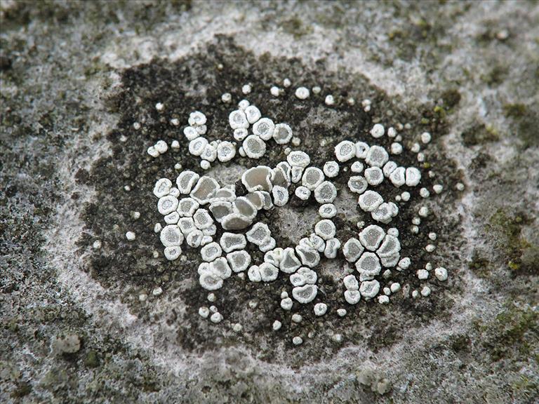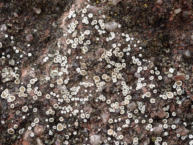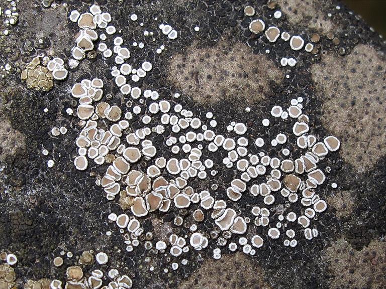 Korstvormige soort met bruine apotheciën met helderwitte of helder geelwitte rand. Thallus zichtbaar als een lichtgrijze vlek, ingezonken in het substraat. Apotheciën staan op regelmatige afstand van elkaar en zijn binnen een thallus vaak van gelijke grootte. Op kalkrijke horizontale oppervlakken die tijdelijk vochtig blijven, zoals stoeptegels en liggende kalkstenen grafstenen. Myriolecis dispersa heeft apotheciën met een minder opvallende, heldergrijze rand die vaak dicht opeen staan. Myriolecis hagenii heeft bruingrijze apotheciën met een grijze rand. De apotheciën zijn binnen een thallus in allerlei ontwikkelingsstadia te vinden.