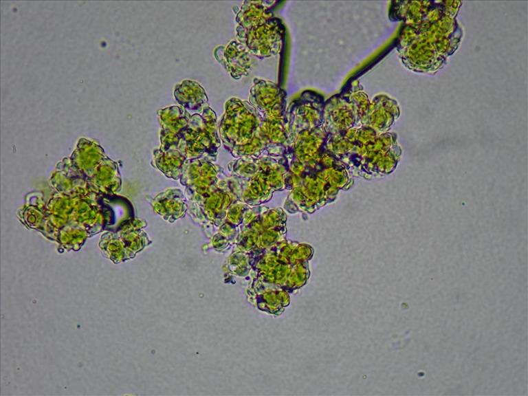 Op oude beukenhaag. Sorediën met Trentepohlia-cellen omgeven door een paar hyfen., Baarn, Baarnse Bosch, © Lukas Verboom