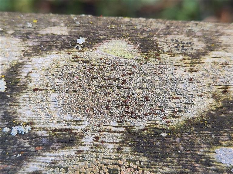 Unguiculariopsis thallophila op Lecanora chlarotera, substraat iets verweerd houten bankje, Hertenkamp, Delft, © Patrick Ehlert