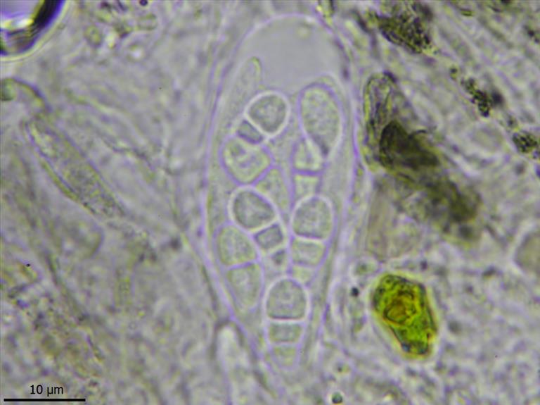 Jonge ascus met sporen. De sporen hebben als ze rijp zijn 3 septen, maar houden er soms minder. De eindcel is vergroot., Oostkapelle, © Lukas Verboom